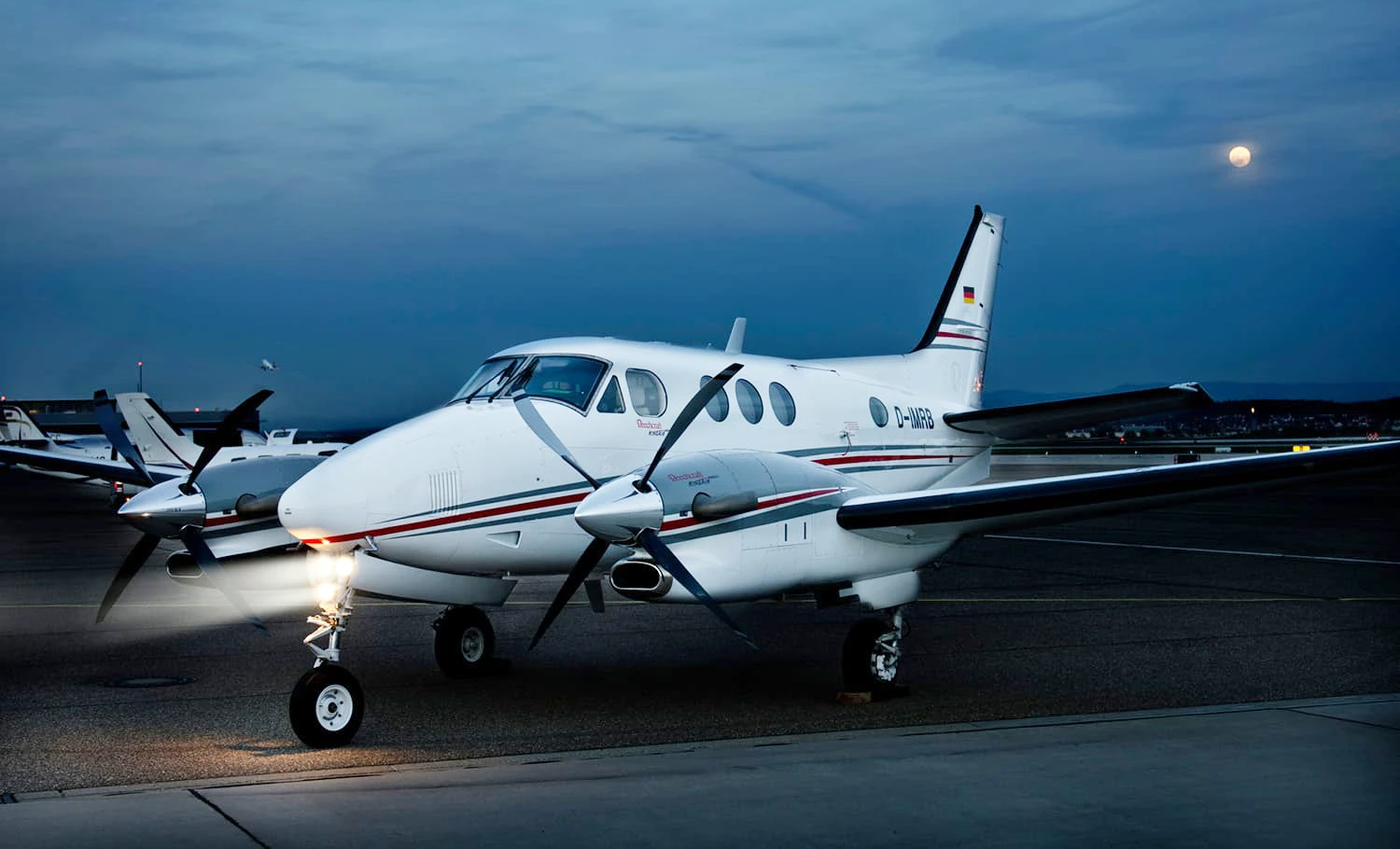 The Kingair C90GTI accommodates five to eight passengers and is equipped with a lavatory and in-flight cabin access to a pressurized baggage compartment. With a range of 1,600 km it is particularly suitable for short flights of up to two hours.
